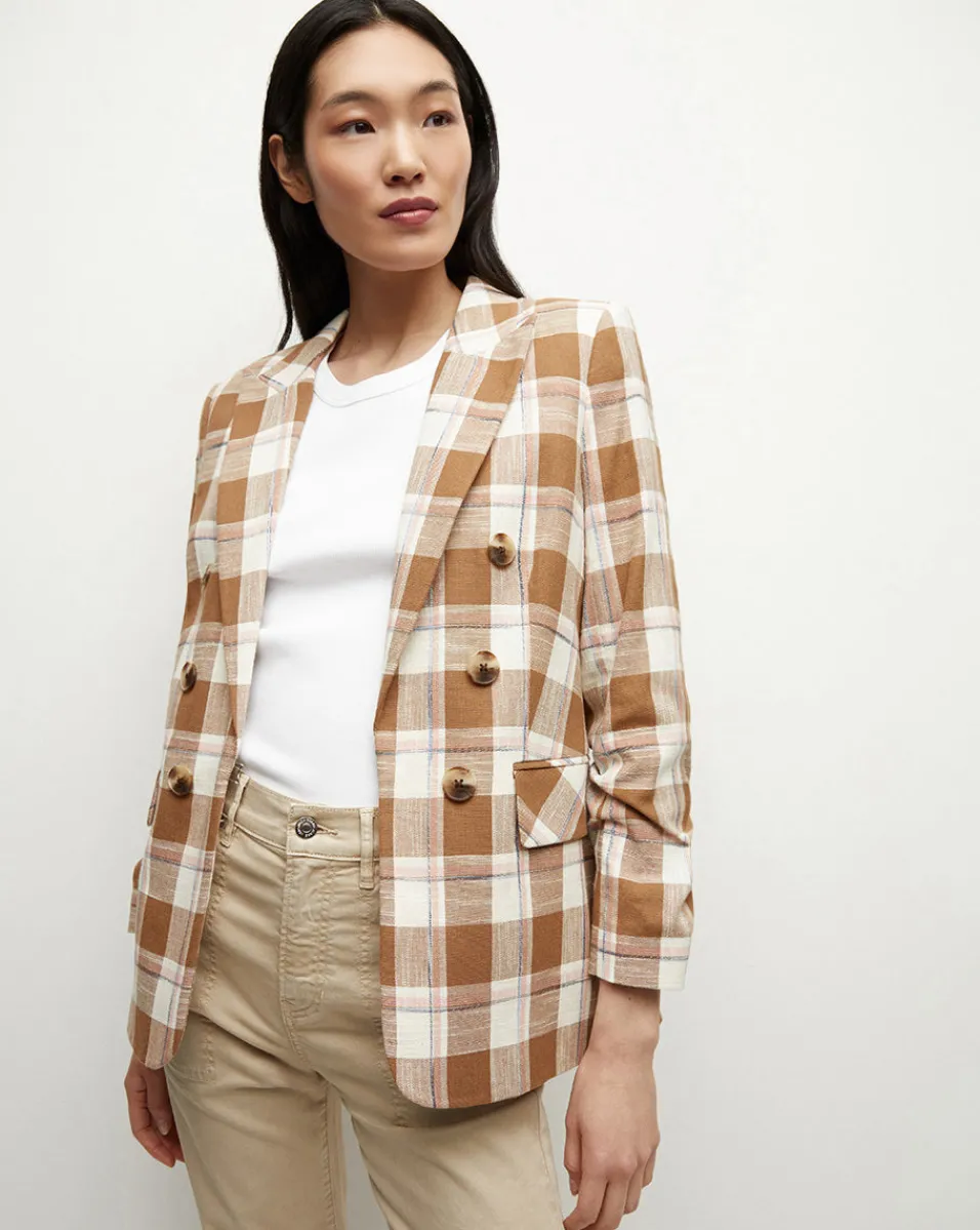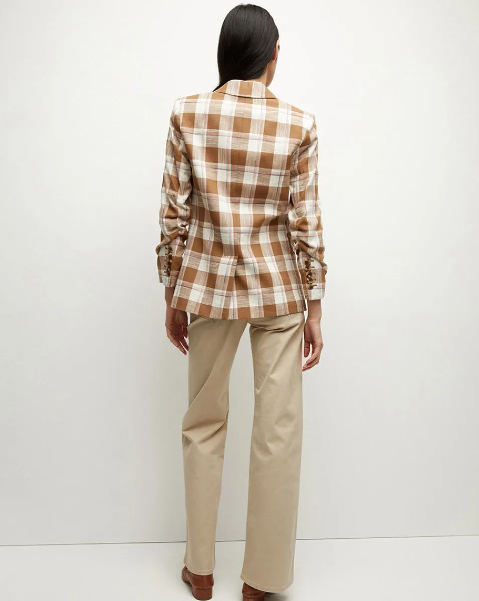 Finished with pre-ruched sleeves, peak lapels and flap pockets, the double-breasted silhouette is designed to pair with the matching Haina Short.