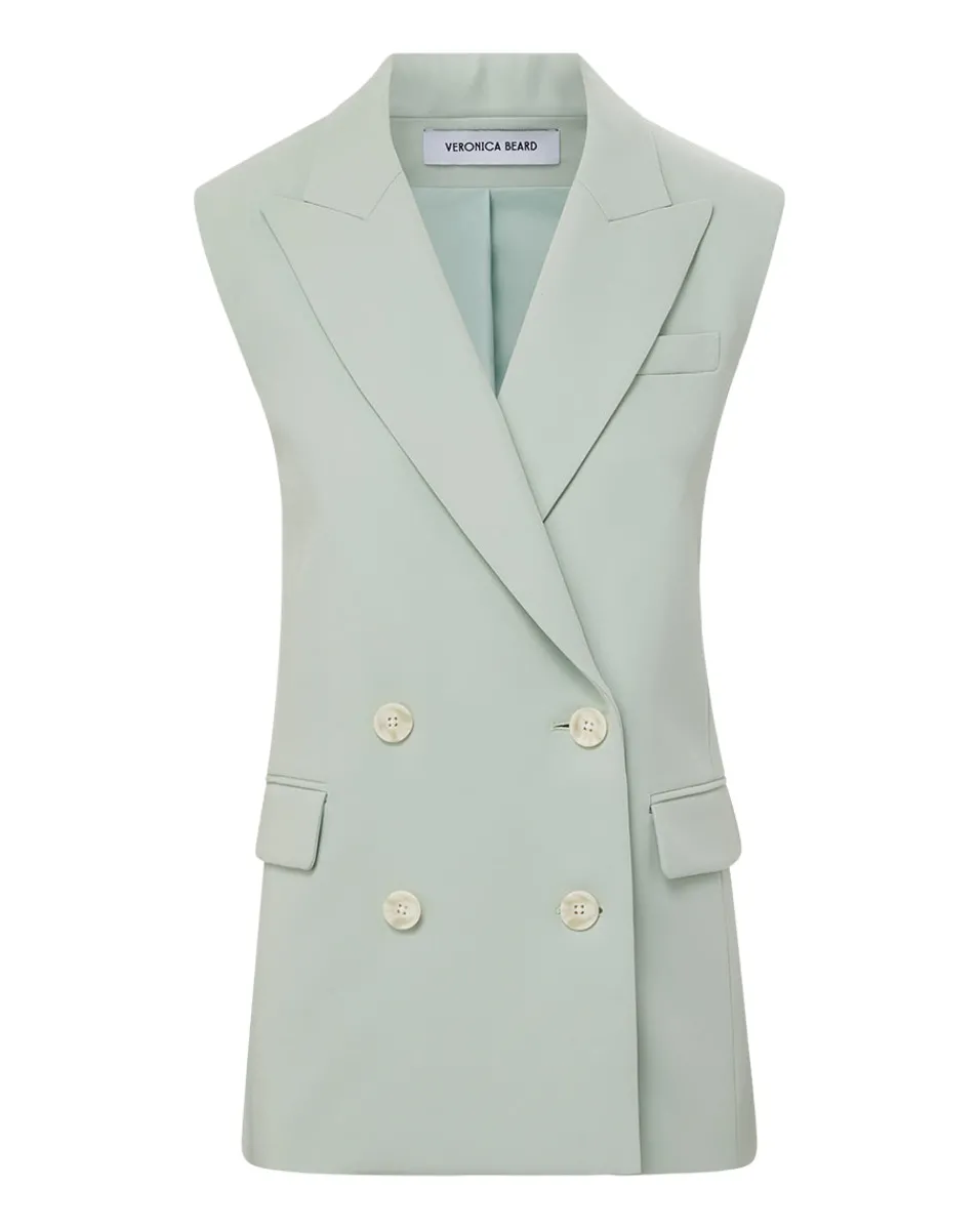 The sleeveless silhouette and oversized fit deliver a boost of cool-girl style, while the double-breasted construction, padded shoulders and peak lapel add polished formality.