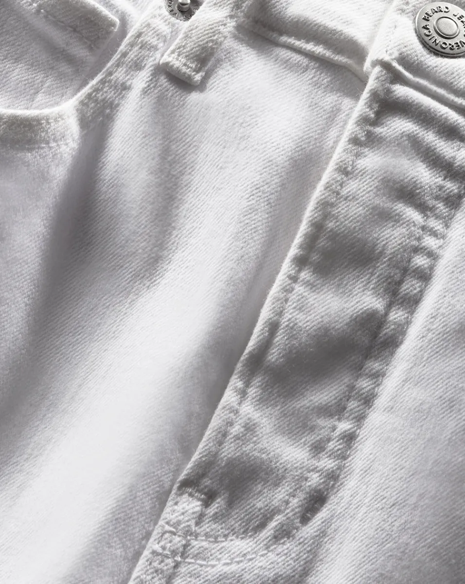 In our fresh white wash, the Beverly jean features a high-rise waist that is fitted through the hips and thighs with a subtly flared leg.