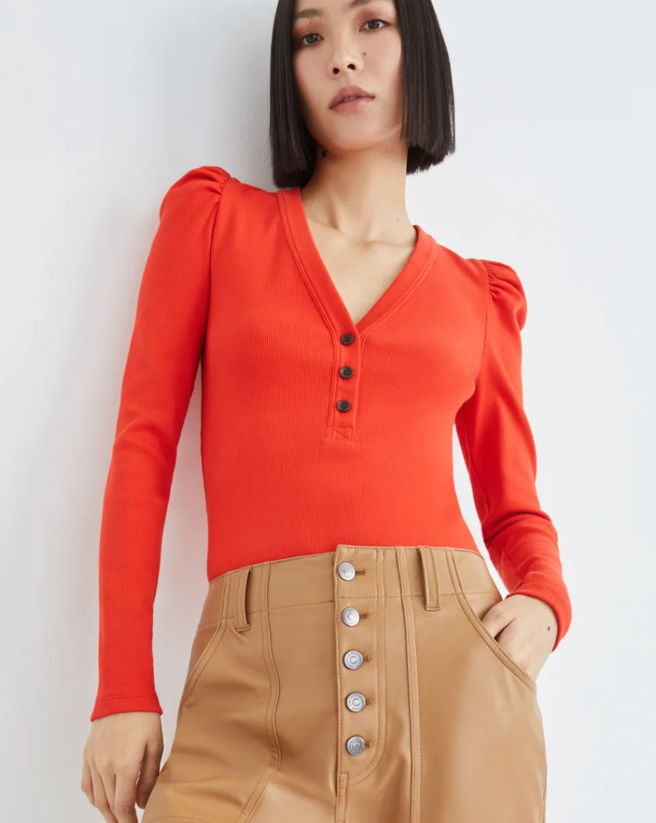 With a slim ribbed fit and deep V-neck, this has all the ease of a tee—but with the feminine romance of gently puffed shoulders.