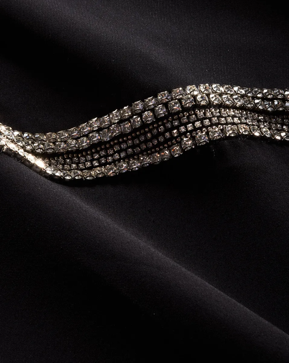 Pair this black rhinestone dress with silver stilettos and a minaudiére for an elegant night out.