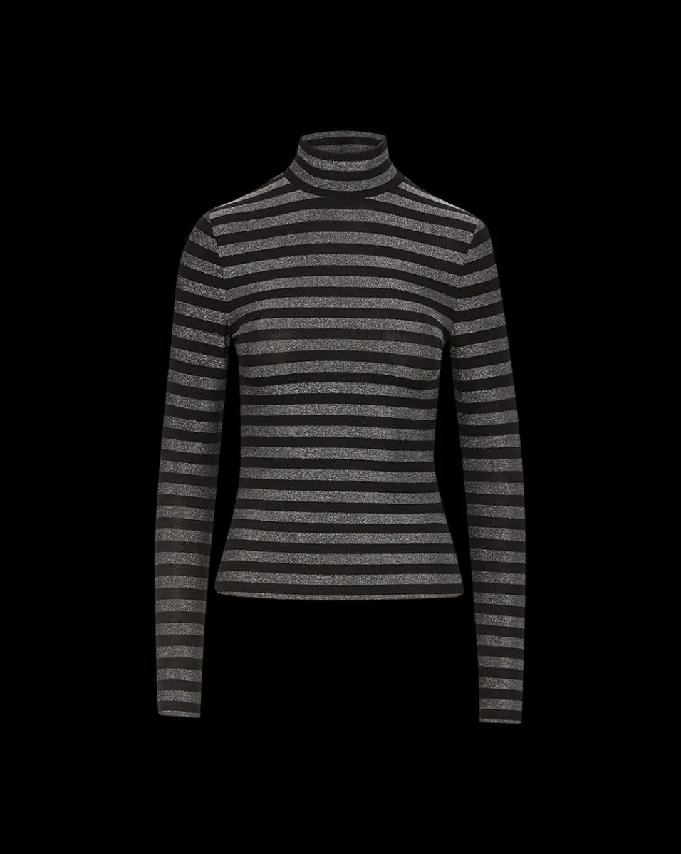 The Nate turtleneck boasts a slim, body-skimming fit and bold stripes in black and metallic gunmetal.