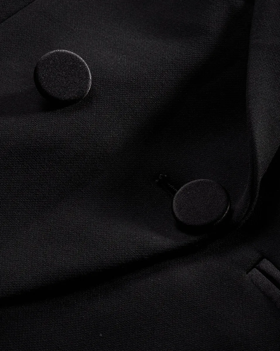 Expertly tailored in the US, this double-breasted style is defined by an angled cutaway hem and diagonal welt pockets.