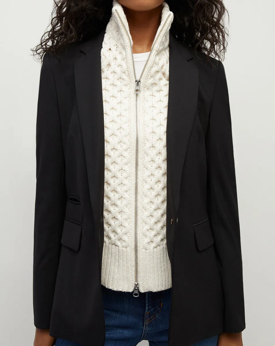 With a rustic cable stitch in soft merino wool and a two way front zipper, this is the ultimate layering option.