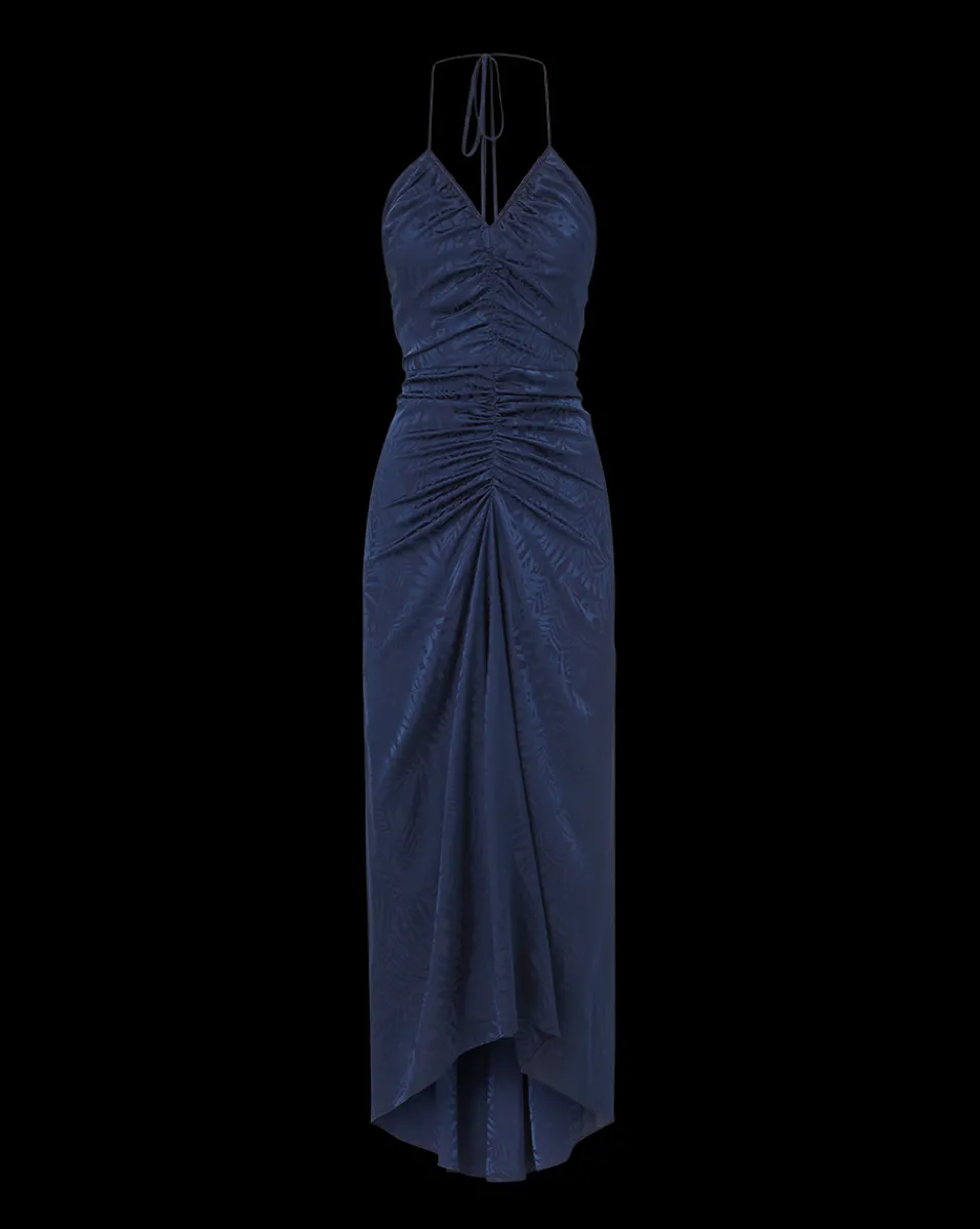 With a subtle sheen, halter neckline, ruching along the center bodice and a flirty high-low hem, this dress is RSVP-ready.
