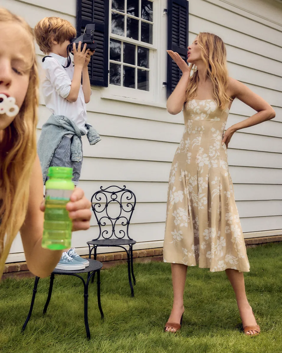 Made from lightweight stretch linen in a neutral floral print, this swingy sundress has an empire waist and a halter neckline that buttons at the nape.