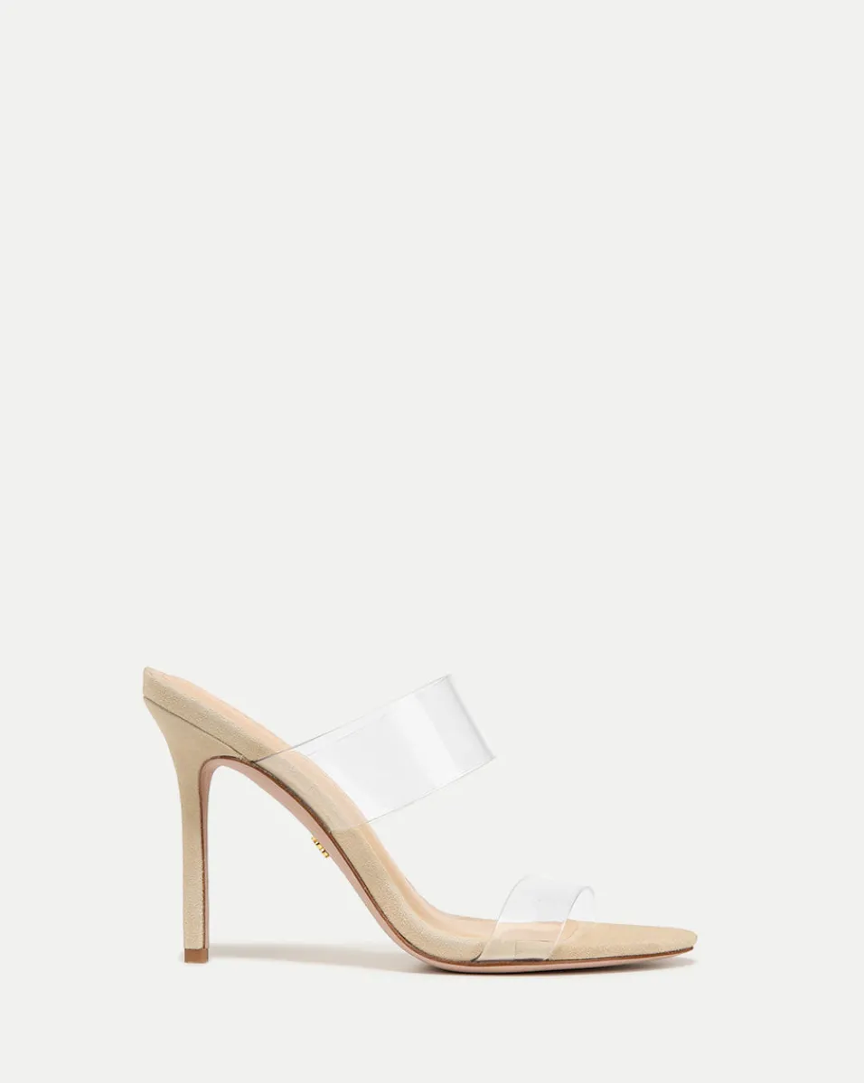 With a double-strap PVC vamp, a nude suede base and a 4″ stiletto heel, this beautifully crafted style comes with magically, leg-lengthening powers.