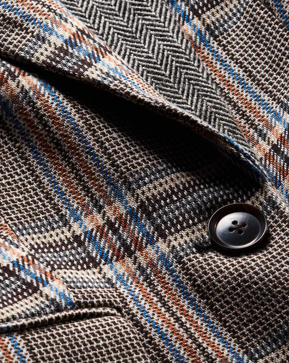 The single-breasted Blyth features an extra lapel on one side, which features a chevron pattern for artful contrast and can be styled in various ways—doubled up, popped, or buttoned across.