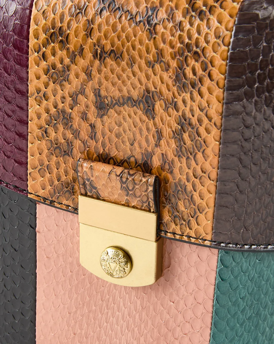 A compact companion with enough room for everything, this bag is defined by a color-blocked patchwork of snakeskin and finished with sleek hardware.