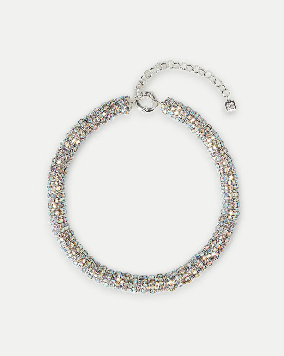 Made with sparkling rondelle beads in silver plated brass, glass crystals, and an oversized silver plated spring ring opener.