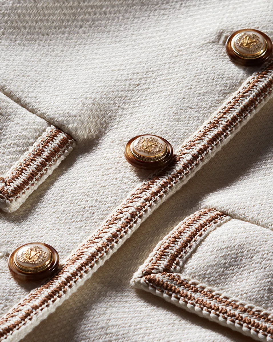 Expertly tailored from a lightweight cotton blend, the Makayla features a boxy, cropped silhouette and an embroidered striped trim along the edges, collar and flap pockets.