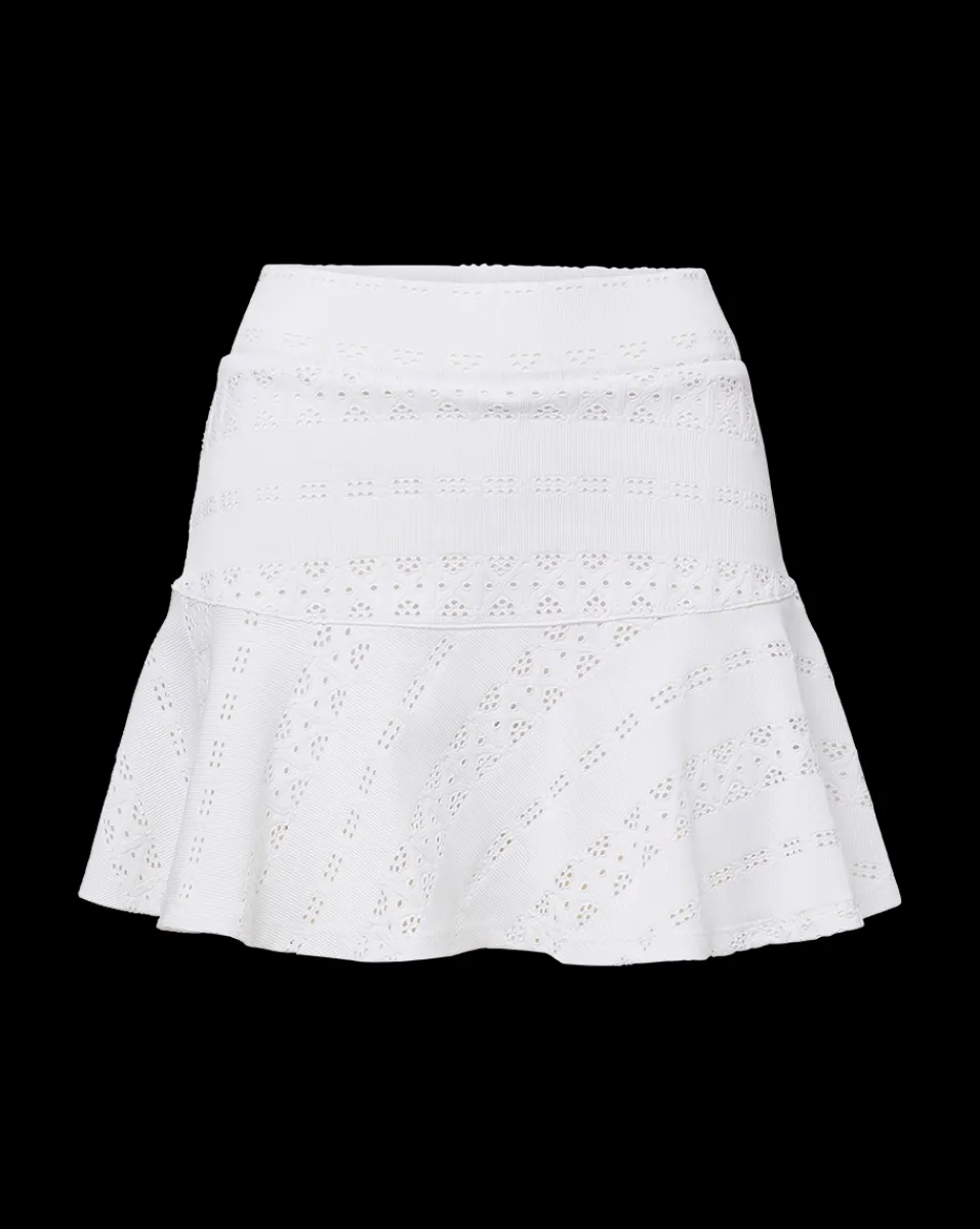 Made from 4-way stretch pointelle lace, this lightweight A-line skort features a wide, pull-on waistband and slightly ruffled hem.
